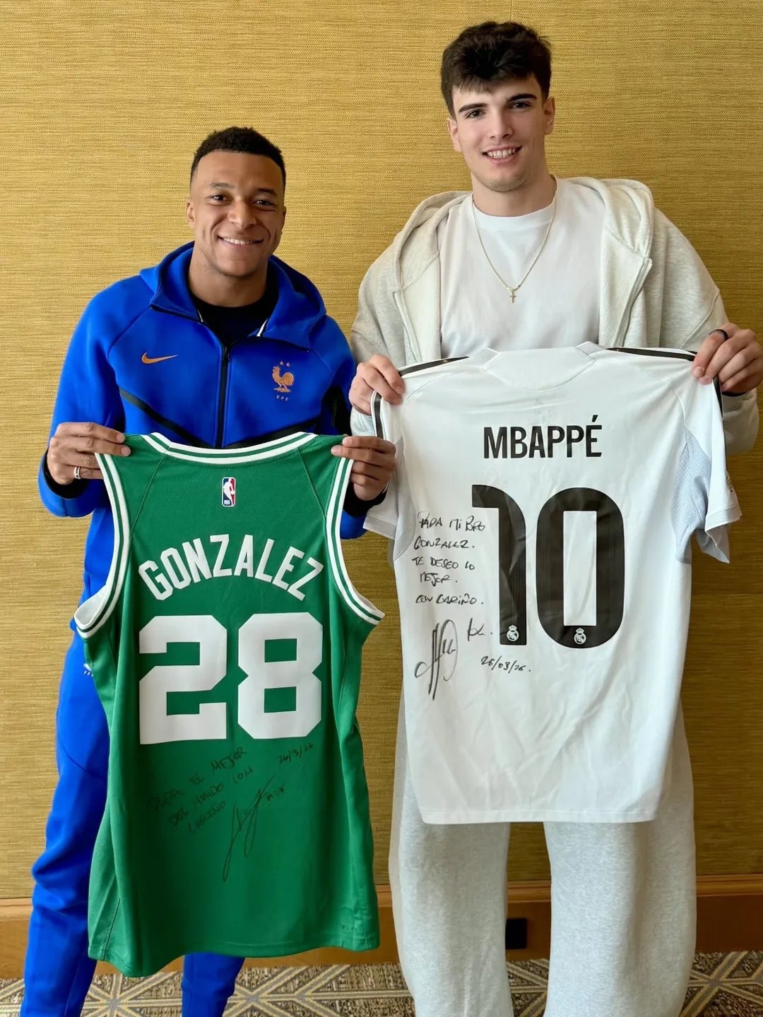 "Para el mejor del mundo con cariño", escribió Hugo González en su camiseta número 28 de los Boston Celtics que entregó a Mbappé.