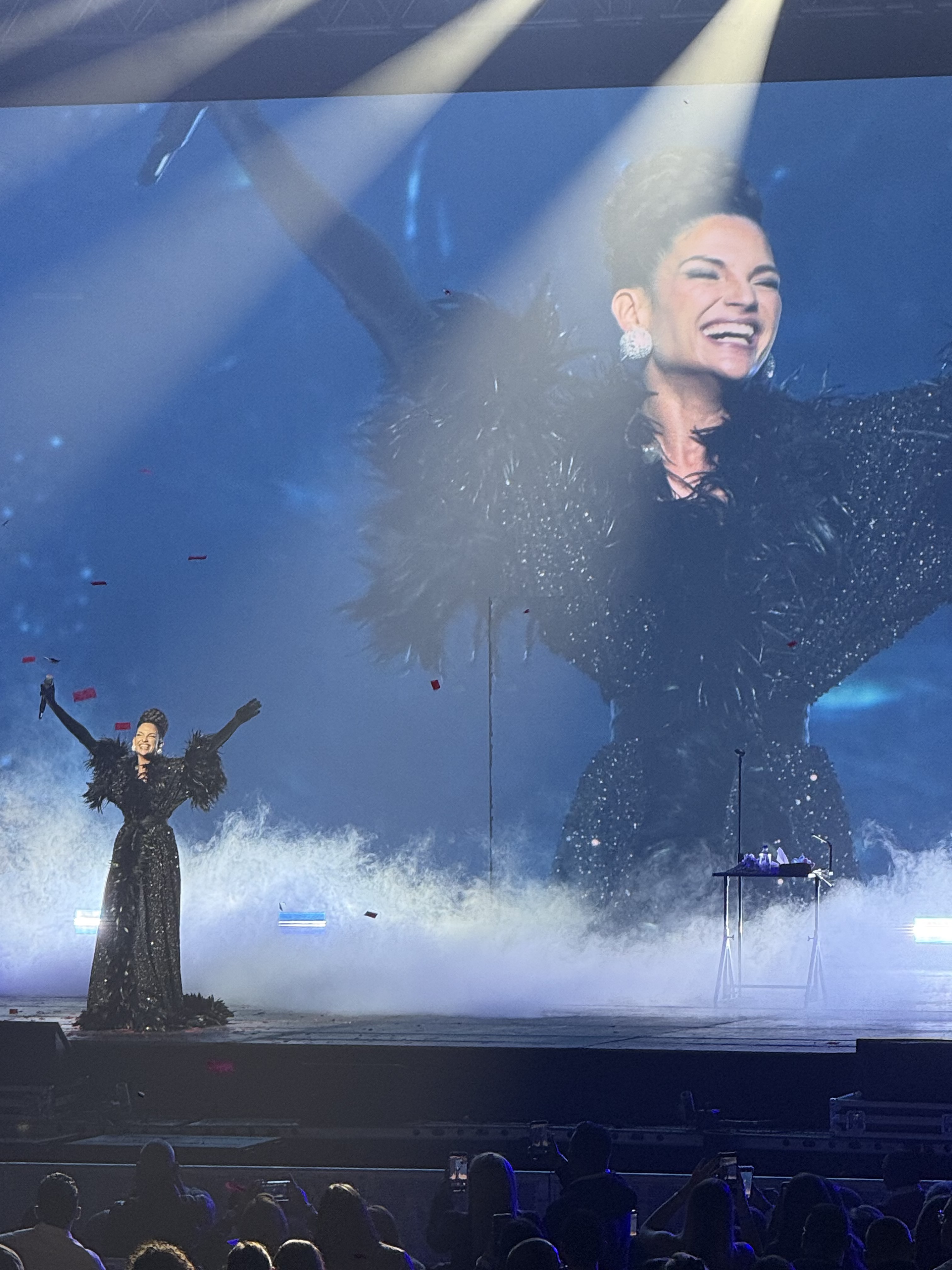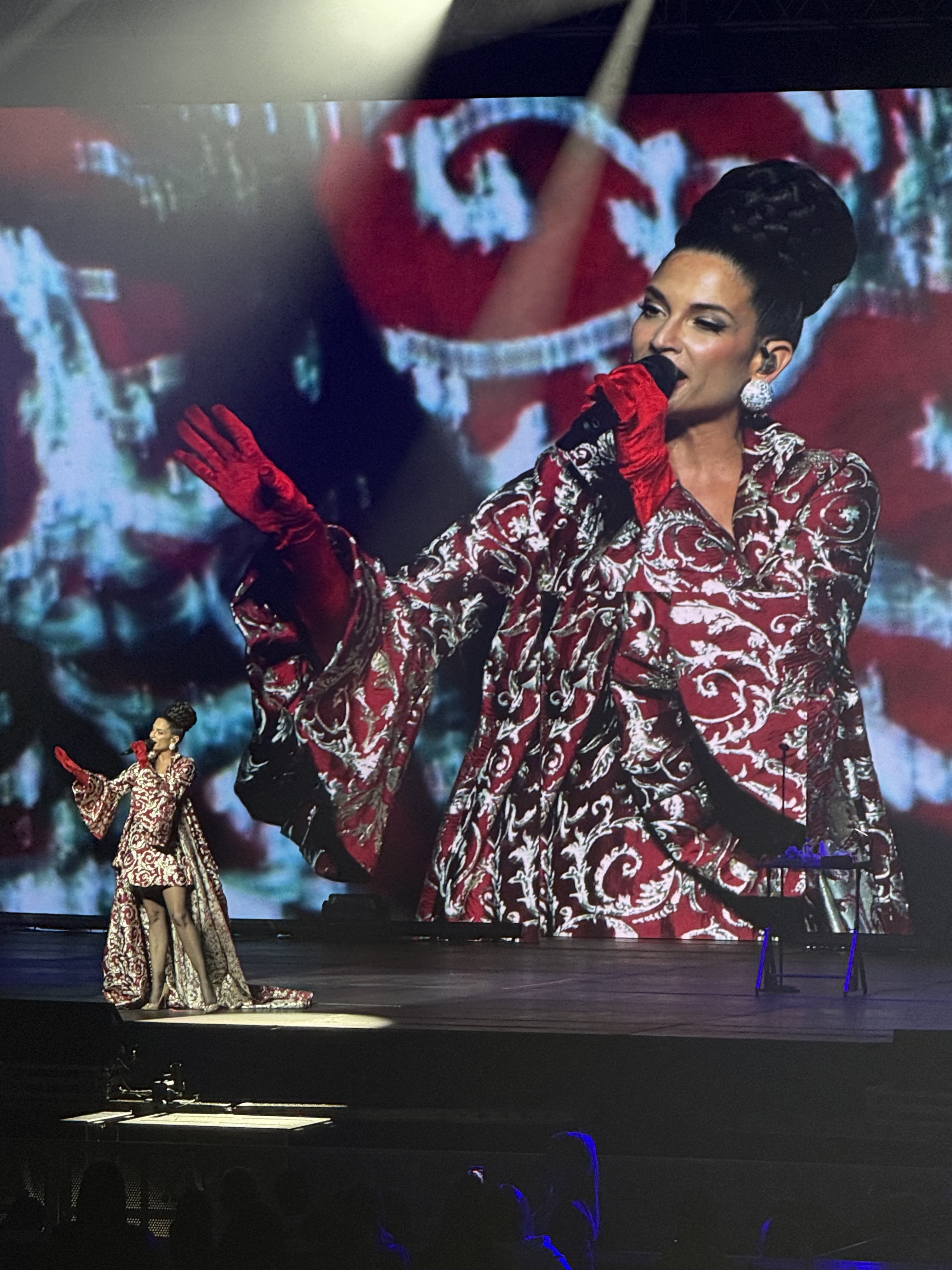 El emblemático recinto capitalino se llenó de magia al salir en pantalla un video en el cual la artista aparece desde la niñez hasta la adultez proyectando así sus años de trayectoria. Tras el audiovisual, la española subió al escenario luciendo un vestido rojo para interpretar clásicos como "El triste", "Gavilán o paloma" y "Si no te hubieras ido".