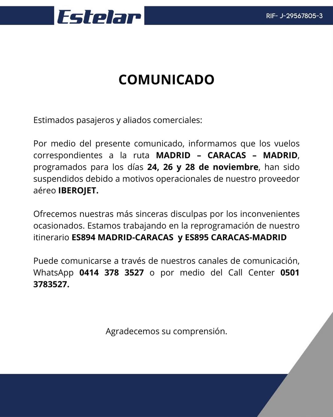 Esta ampliación en las cancelaciones se produce después de que, hasta el lunes, Estelar ya hubiera suspendido los vuelos correspondientes al período del 24 al 28 de noviembre.