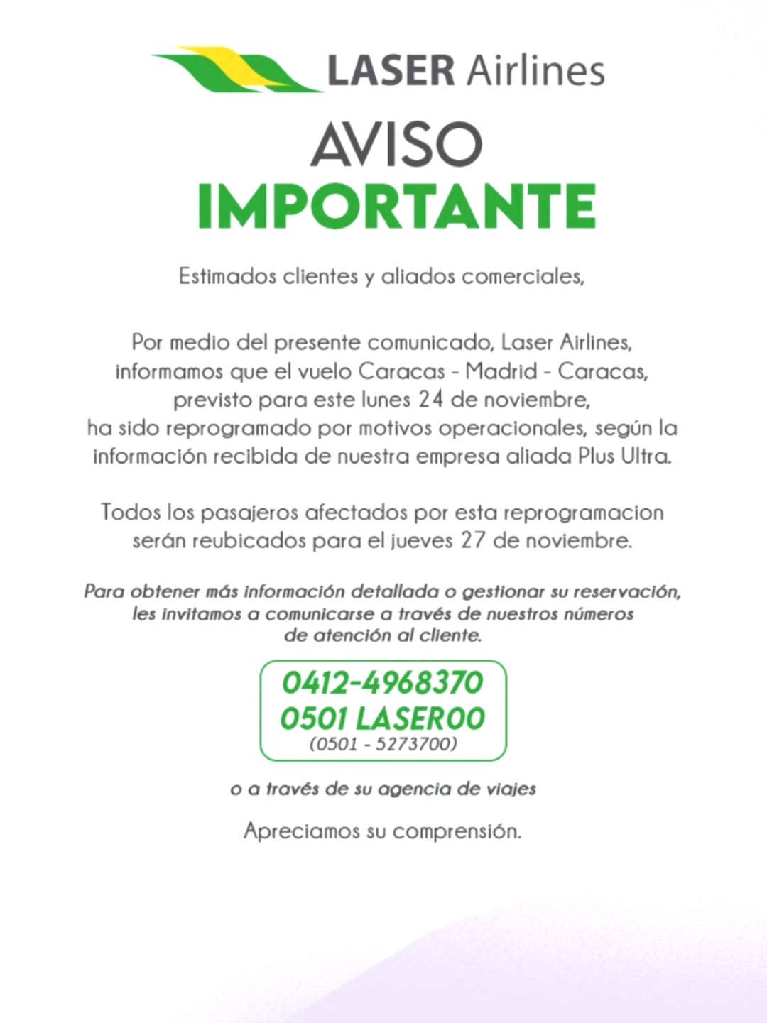 Laser, que vuela a España en alianza con la aerolínea Plus Ultra y tiene frecuencia de tres vuelos semanales, no aclaró si estos viajes serán reprogramados. La compañía instó a los pasajeros a contactar por teléfono o a través de sus agencias de viajes para obtener más información.