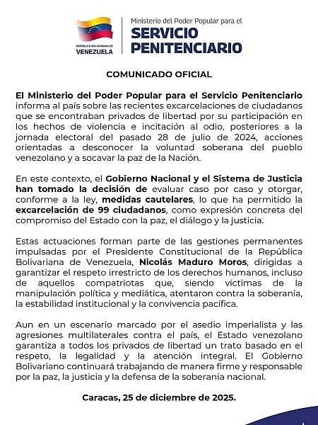 Según el comunicado, la medida responde a una evaluación caso por caso realizada por el Sistema de Justicia, mediante la cual se otorgaron medidas cautelares gestiones que adelanta el gobierno nacional para promover la paz y el diálogo en el país, así lo señala el texto emitido por el Ministerio de Servicios Penitenciarios publicado la noche del 25 de diciembre.