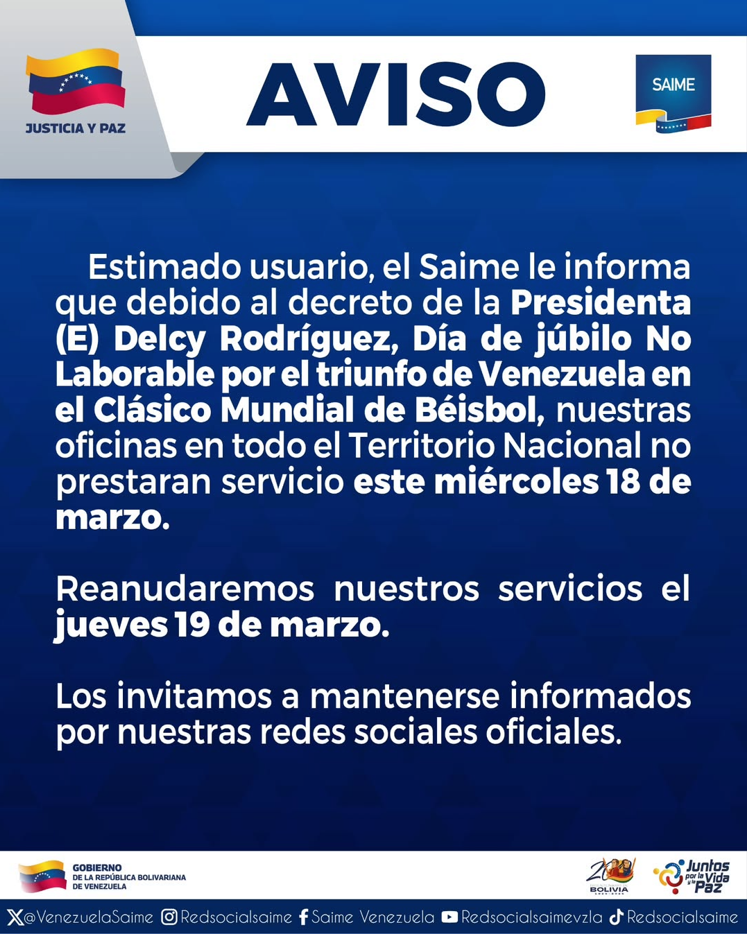 El Saime informó que el día de hoy sus oficinas no prestarán servicio, en todo el territorio nacional, debido al decreto de la presidenta encargada, Delcy Rodríguez, Día de Júbilo Nacional No Laborable, tras la victoria de la selección en el Clásico Mundial de Béisbol.