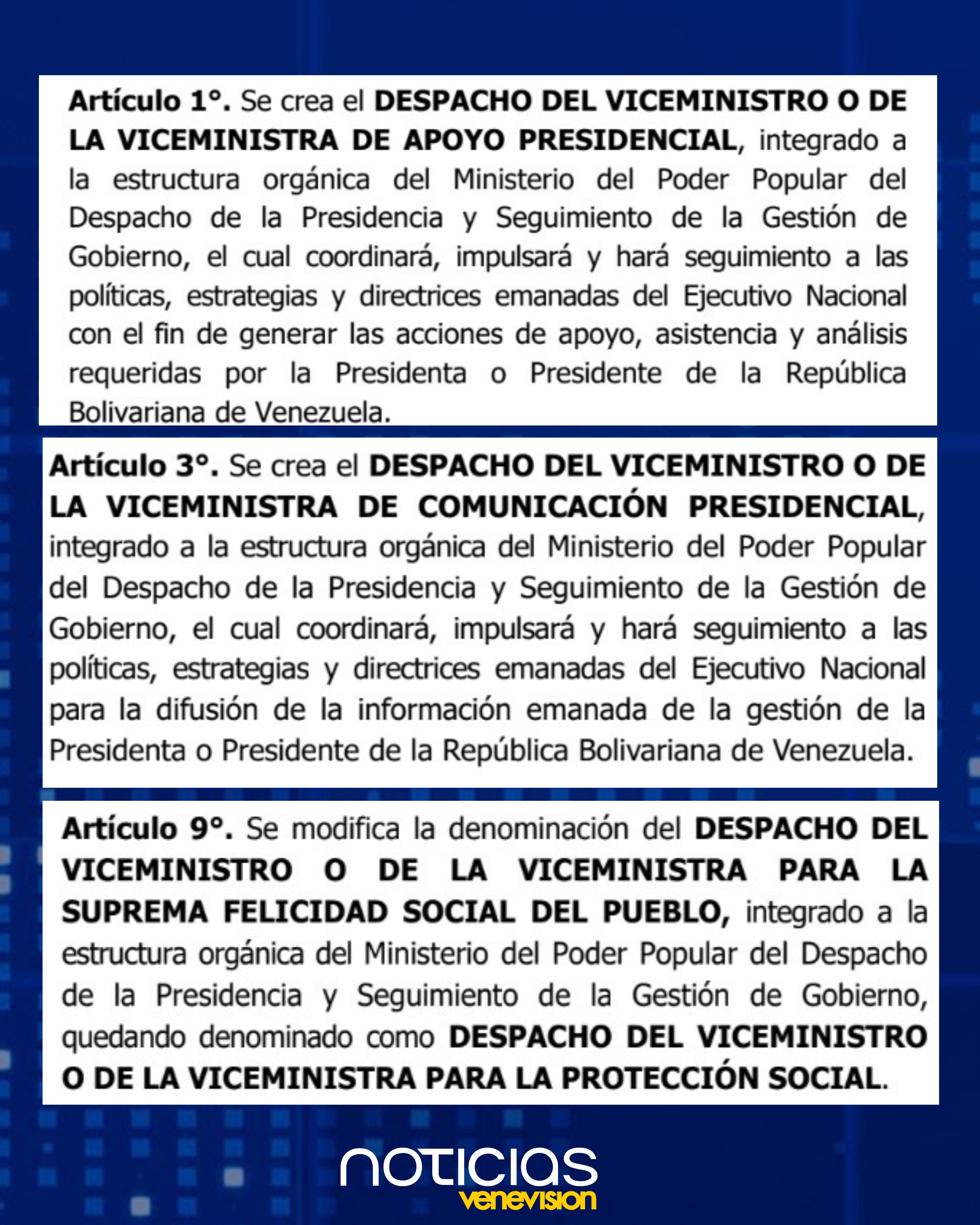 En dicha Gaceta, Rodríguez ordenó crear el despacho del Viceministro de Apoyo Presidencial. El mismo estará integrado a la estructura orgánica del Ministerio del Despacho de la Presidencia y Seguimiento de la Gestión de Gobierno.