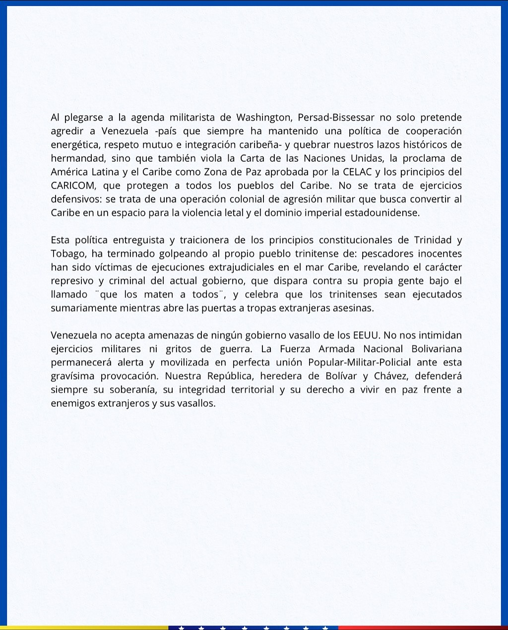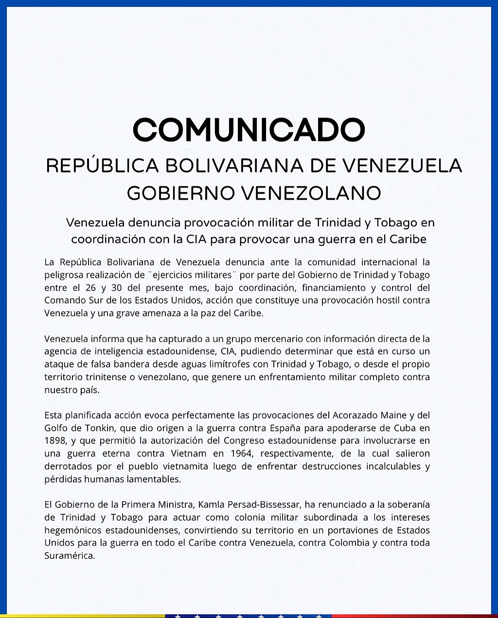 La vicepresidenta de la República, Delcy Rodríguez denunció ante la comunidad internacional la realización de ejercicios militares por parte del Gobierno de Trinidad y Tobago entre el 26 y 30 de octubre, bajo coordinación con la Agencia Central de Inteligencia (CIA) de Estados Unidos para “instalar una guerra” en el Caribe.