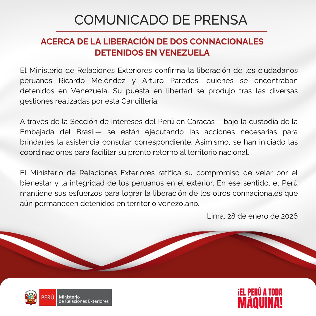 El Ministerio de Relaciones Exteriores de Perú, confirmó este miércoles la liberación de dos ciudadanos peruanos que se encontraban detenidos en Venezuela, identificados como Ricardo Meléndez y Arturo Paredes.
