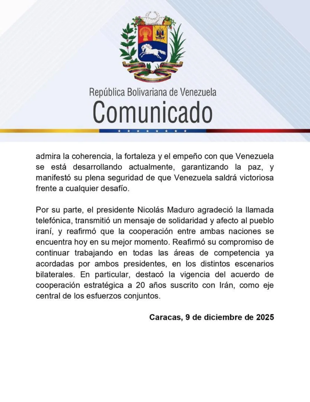 Irán reiteró su plena solidaridad y apoyo incondicional al gobierno y pueblo venezolano en esta etapa, reafirmando su voluntad de estar al lado de Venezuela.