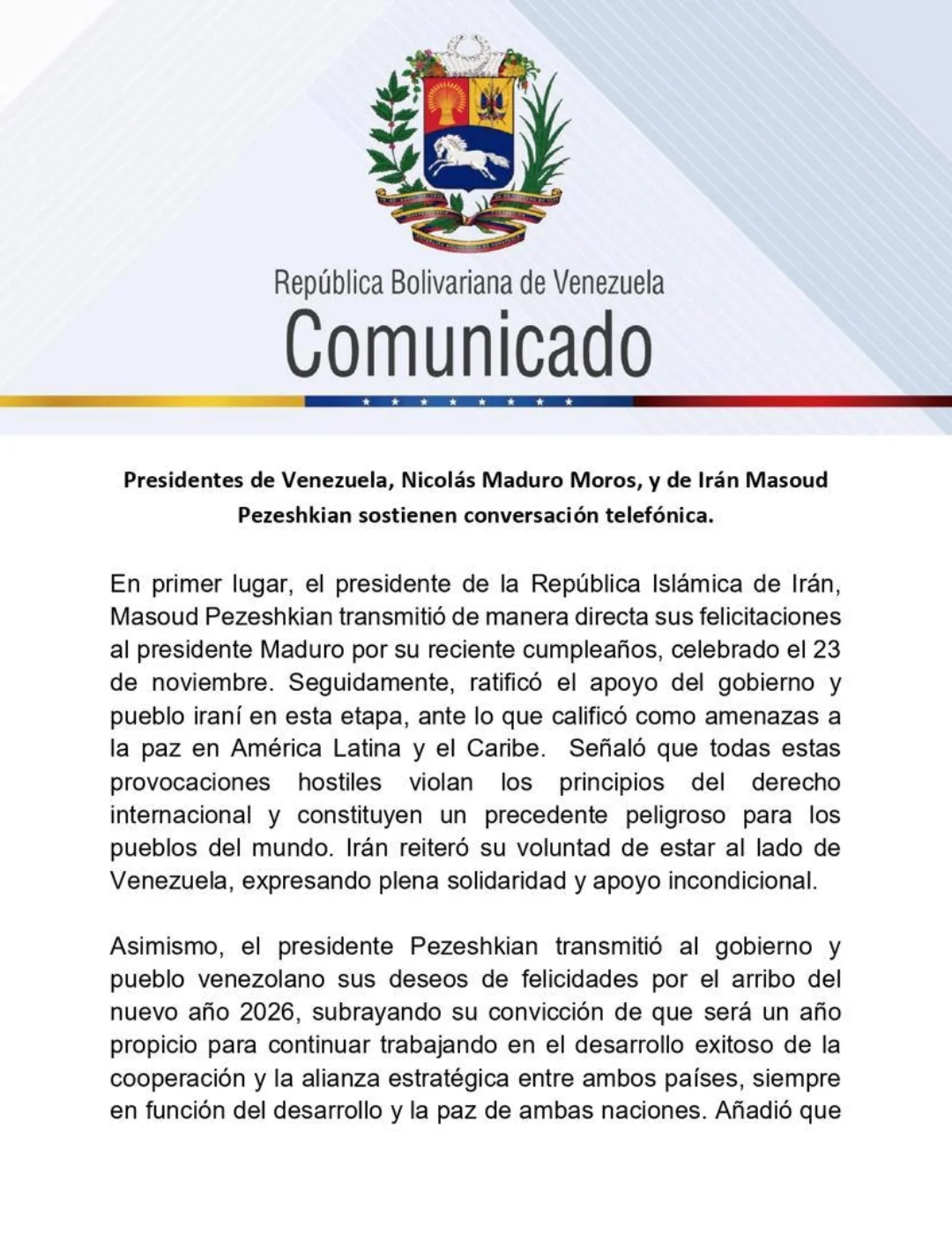 Masoud Pezeshkian, sostuvo una conversación telefónica con Nicolás Maduro, en la que ratificó el apoyo de su país ante la situación de tensión en el mar Caribe.