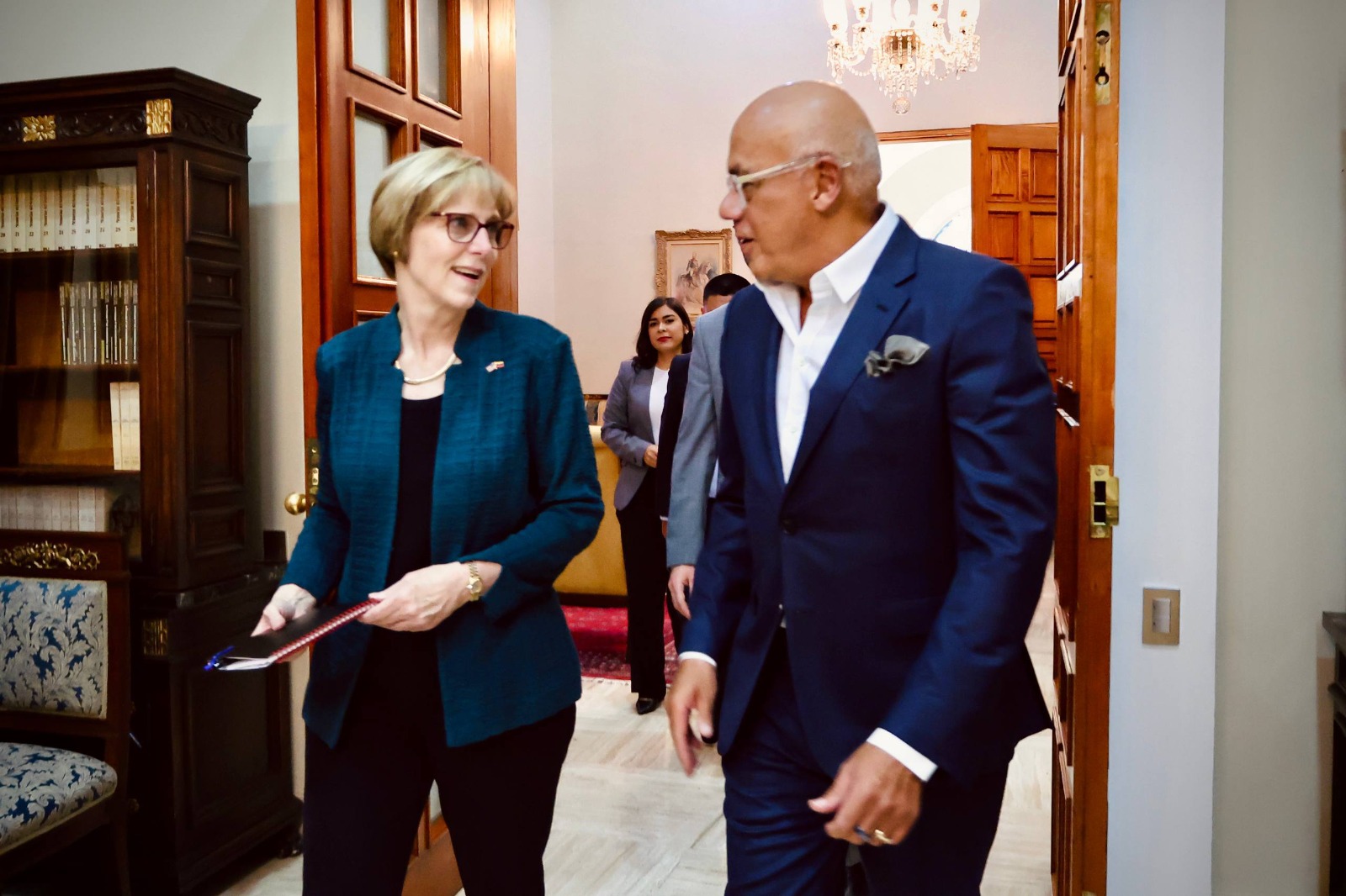 El presidente de la Asamblea Nacional, Jorge Rodríguez recibió este miércoles 18 de marzo a la Encargada de Negocios de los EE.UU. Laura Dogu en el Palacio Federal Legislativo junto a la delegación del Comité de Relaciones Exteriores del Senado estadounidense.